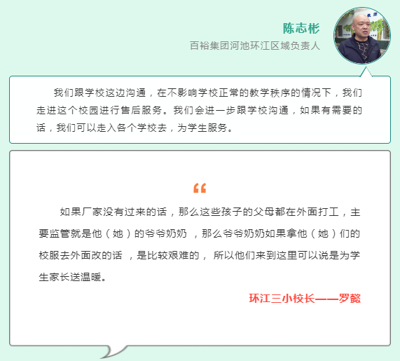 據(jù)了解,2017年6月百裕集團(tuán)環(huán)江裕美扶貧車間成為環(huán)江中小學(xué)的校服供應(yīng)商之一,同時也在環(huán)江縣城橋西路開設(shè)了售后服務(wù)部針對校服不合身等問題進(jìn)行售后服務(wù)。