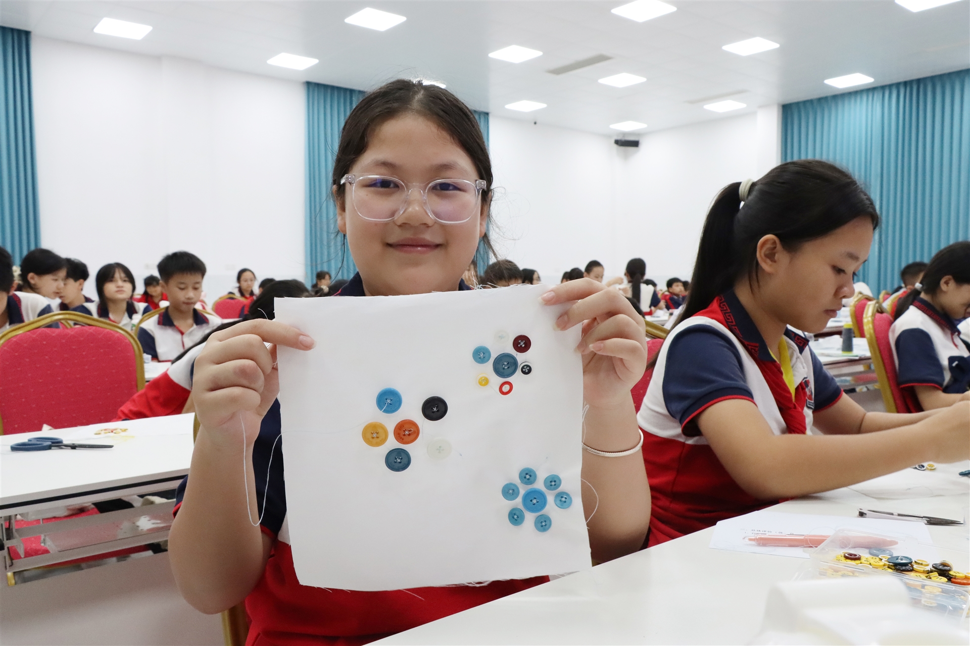 孩子們還體驗了一場別開生面的服飾小制作,領(lǐng)略了制作之美。在老師的指導(dǎo)下,學(xué)生們首先了解紐扣的基本構(gòu)造和縫制紐扣的步驟要領(lǐng),之后再自己動手做“針線活”,用略顯稚嫩的小手把扣子穿牢固定,還發(fā)揮了自己的想象力,把不同的扣子組合拼接,形成一幅幅生動的花朵“畫作”。