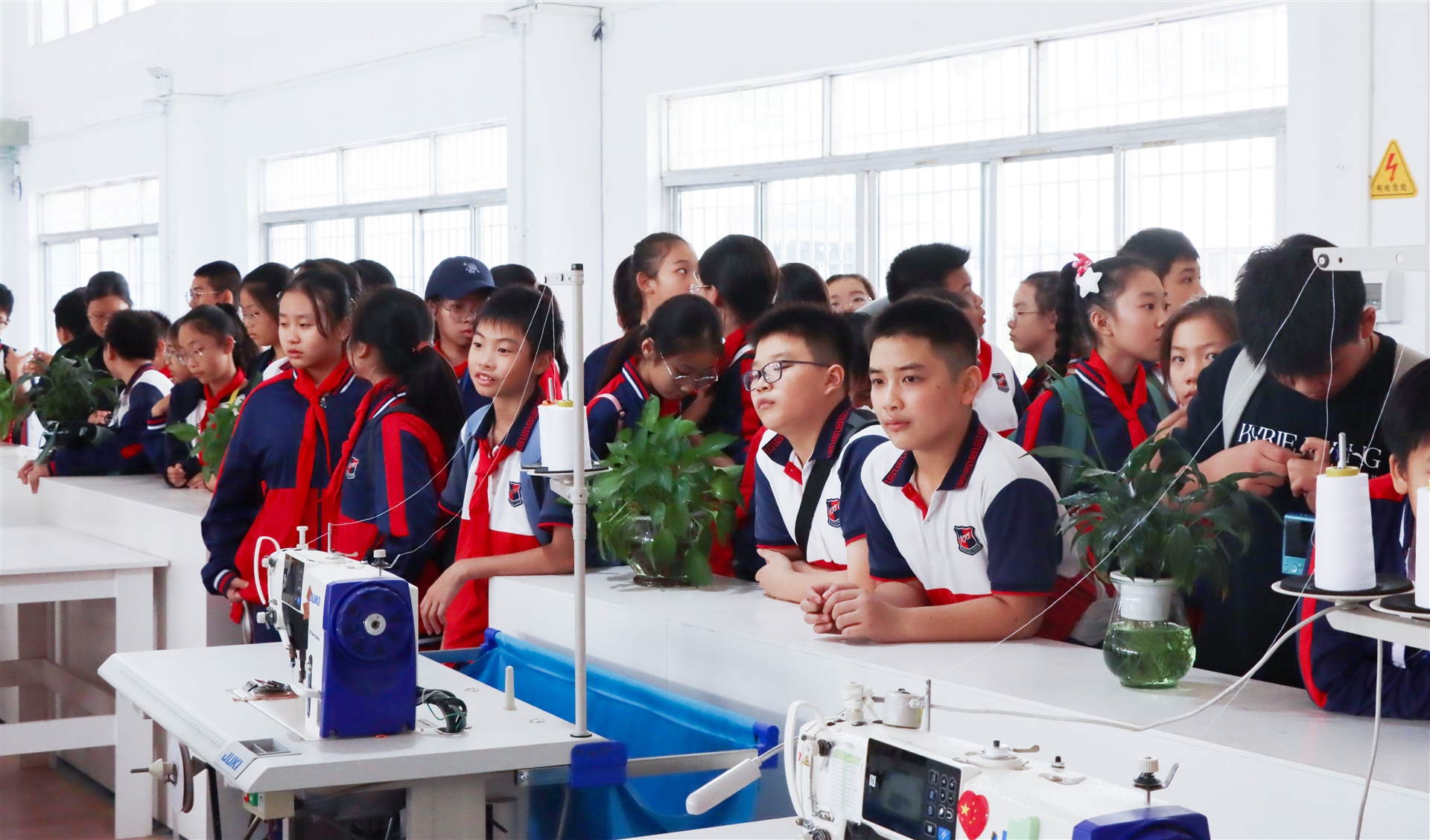 在講解員的引導(dǎo)下,孩子們走進校服展示廳,了解校服的產(chǎn)生和歷史變遷,還參觀了解了校服的服飾面料、款式、紋樣以及背后蘊藏的服飾文化。通過近距離觀察不同民族的服飾和傳統(tǒng)老式縫紉機、織布機,他們不僅感受到了校服文化在歷史長河中的變遷及其魅力,也增強了學(xué)生的校服文化自信。
