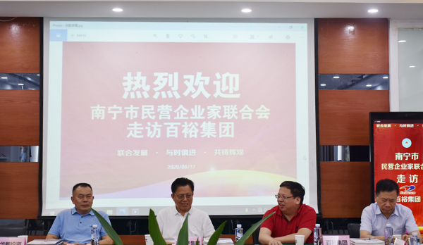 南寧市民營(yíng)企業(yè)家聯(lián)合會(huì)始建于1992年4月,是南寧市成立最早的商會(huì)之一。會(huì)員行業(yè)涵蓋房地產(chǎn)開發(fā)、融資擔(dān)保、建材、制造、礦業(yè)、餐飲、農(nóng)業(yè)、五金機(jī)電、商貿(mào)物流等多個(gè)行業(yè),市場(chǎng)已拓展到美國(guó)、加拿大、日本、韓國(guó)、東盟各國(guó)等地。百裕集團(tuán)董事長(zhǎng)許曲煌做為聯(lián)合會(huì)執(zhí)行會(huì)長(zhǎng),認(rèn)真履行會(huì)員企業(yè)的義務(wù)和工作,積極與企業(yè)會(huì)員企業(yè)交流學(xué)習(xí)。此次走訪活動(dòng)中,各企業(yè)家參觀了百裕集團(tuán)產(chǎn)品展示廳、觀看了集團(tuán)各分公司、生產(chǎn)中心、研發(fā)中心等相關(guān)視頻短片,并在會(huì)議室進(jìn)行了交流會(huì)議。