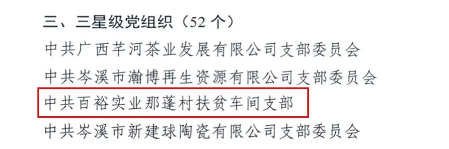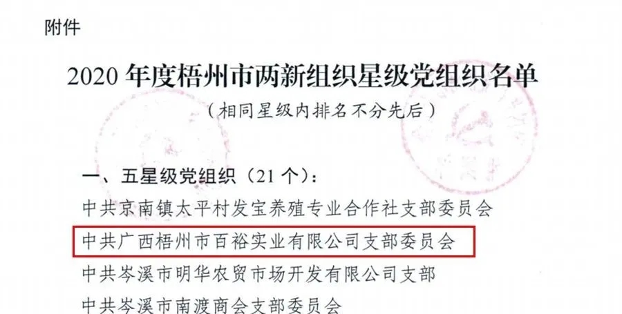 近日,中共梧州市委員會組織部印發(fā)《關(guān)于公布2020年度梧州市兩新組織星級黨組織名單的通知》,對全市109家兩新組織星級黨組織名單進(jìn)行公布,其中,百裕實(shí)業(yè)黨支部獲評“五星級黨組織”稱號,育龍黨支部獲評“四星級黨組織”稱號,百裕那蓬扶貧車間獲評“三星級黨組織”稱號。