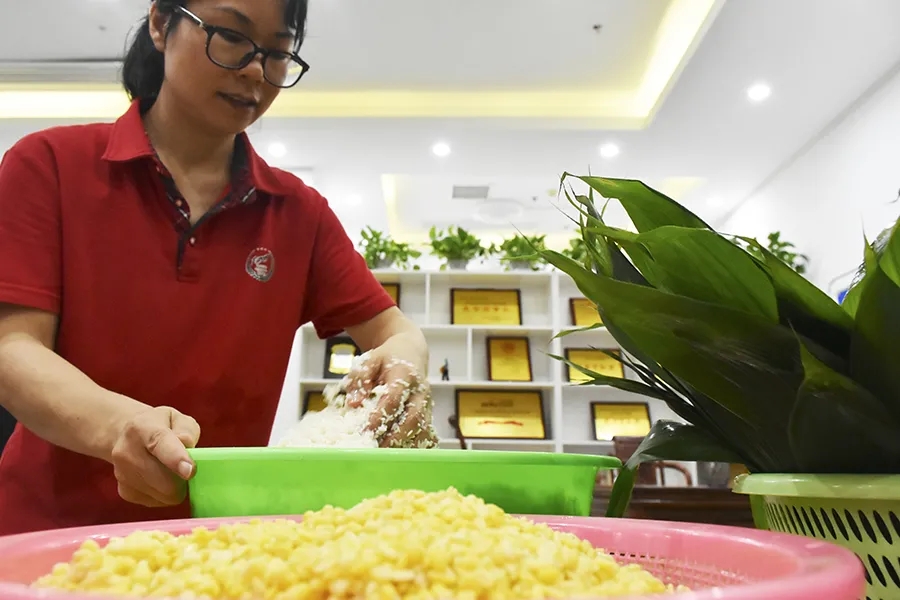 后勤部精心為大家準(zhǔn)備了豐富的食材五花肉、雞蛋、香菇、魷魚(yú)、海蠣、綠豆,并根據(jù)員工喜好調(diào)配好兩種不同口味餡料。