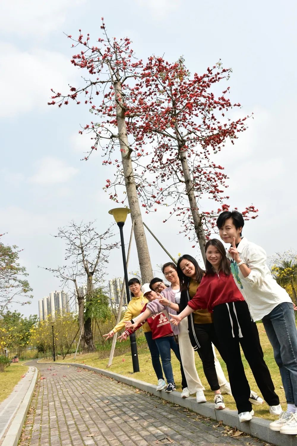 江南公園里黃風(fēng)鈴花金黃一片,靈動美麗!桃花嬌艷欲滴、木棉花不像一般花草必須貼近才可欣賞,聳立在高枝上的她,不論遠(yuǎn)近,望過去,都是一副美麗的景象。